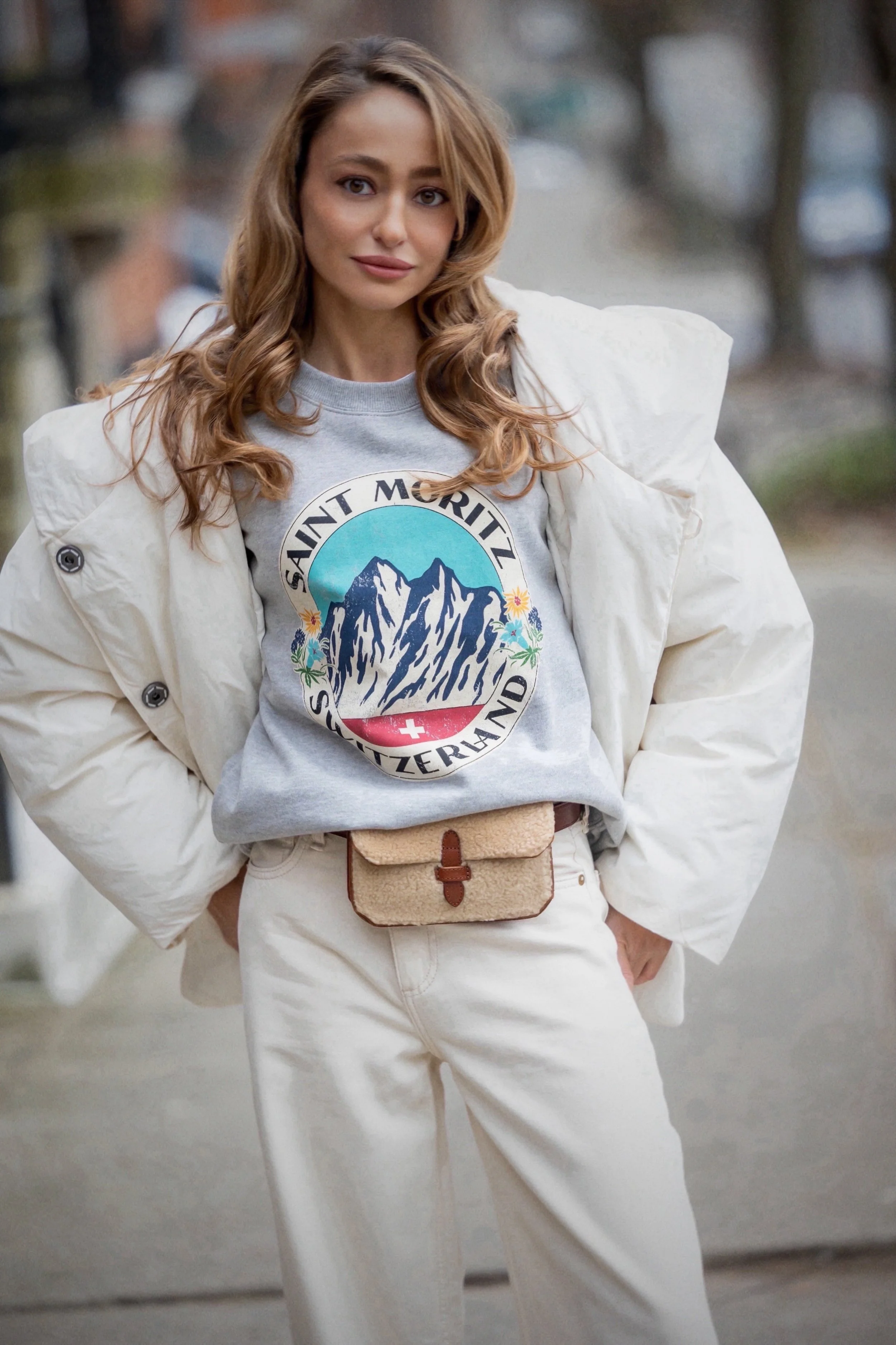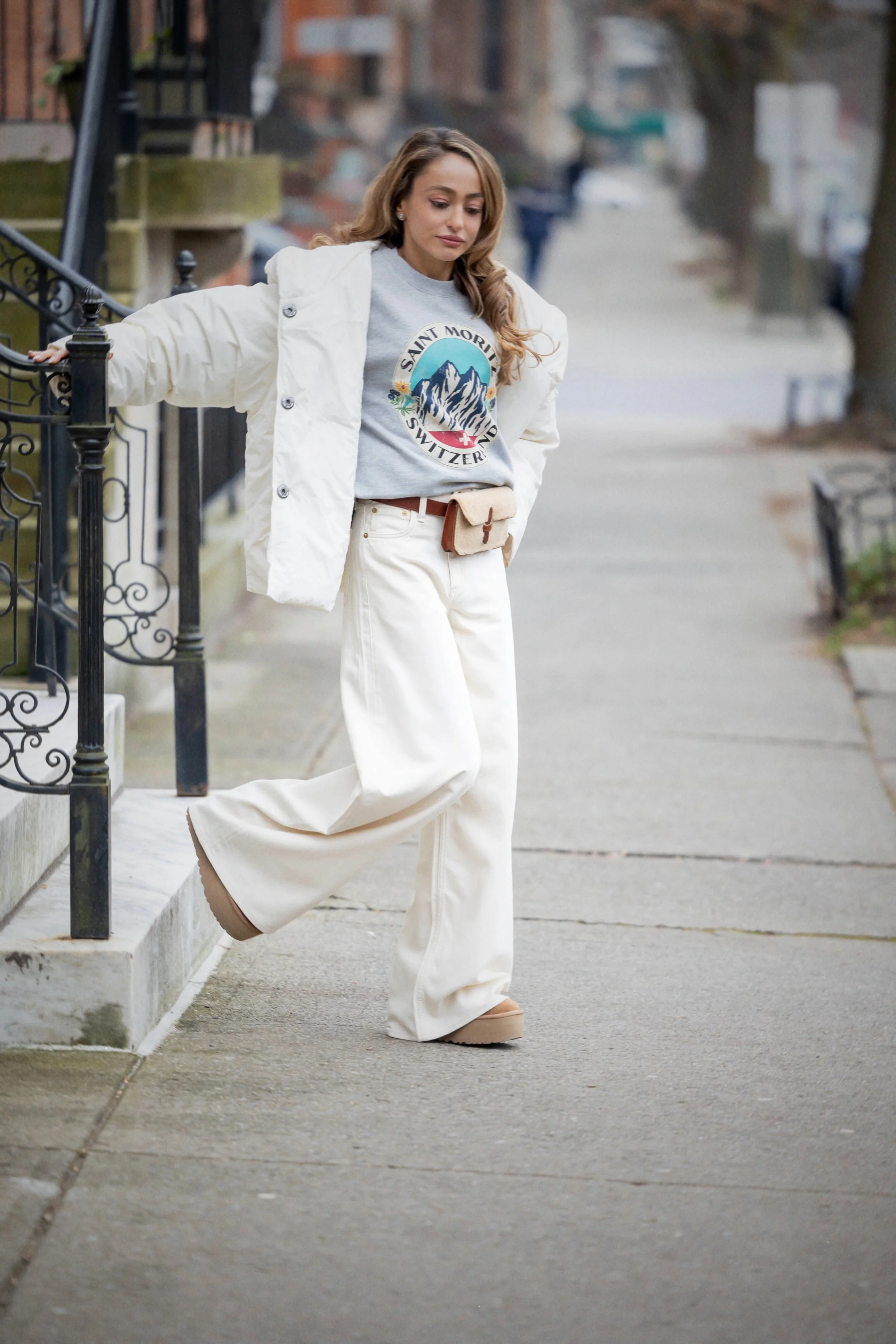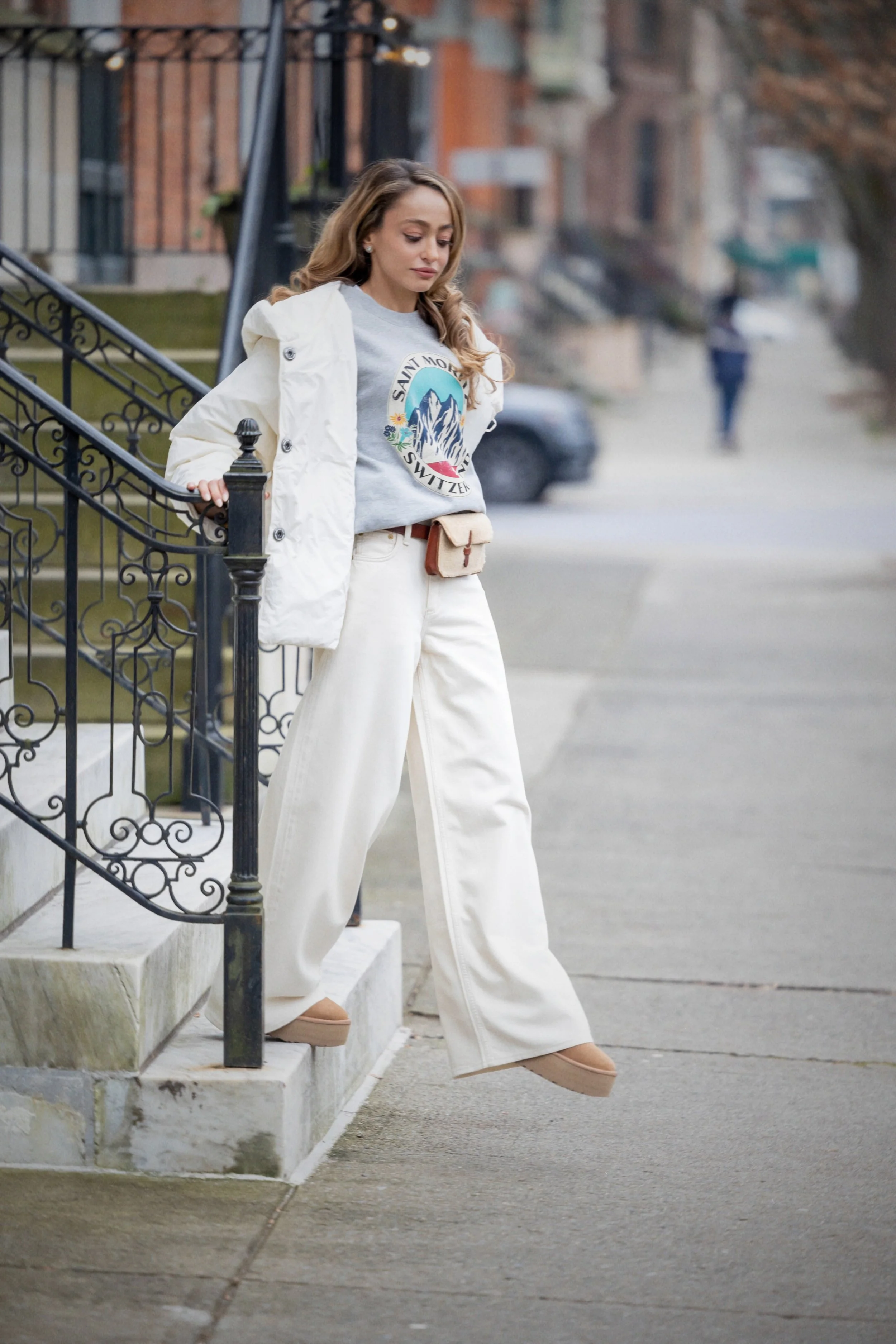 I paired them here with a classic crewneck, puffer jacket, and obviously the wear-with-everything ultra mini platform Uggs. A worn illustration with Saint Moritz, Switzerland amplifies the vintage attitude of this graphic sweatshirt that is sized to slouch like an old favorite. Unfortunately this piece is now sold-out, however I linked a bunch of similar options I also love. On a more positive note, almost every other piece is now on major sale.