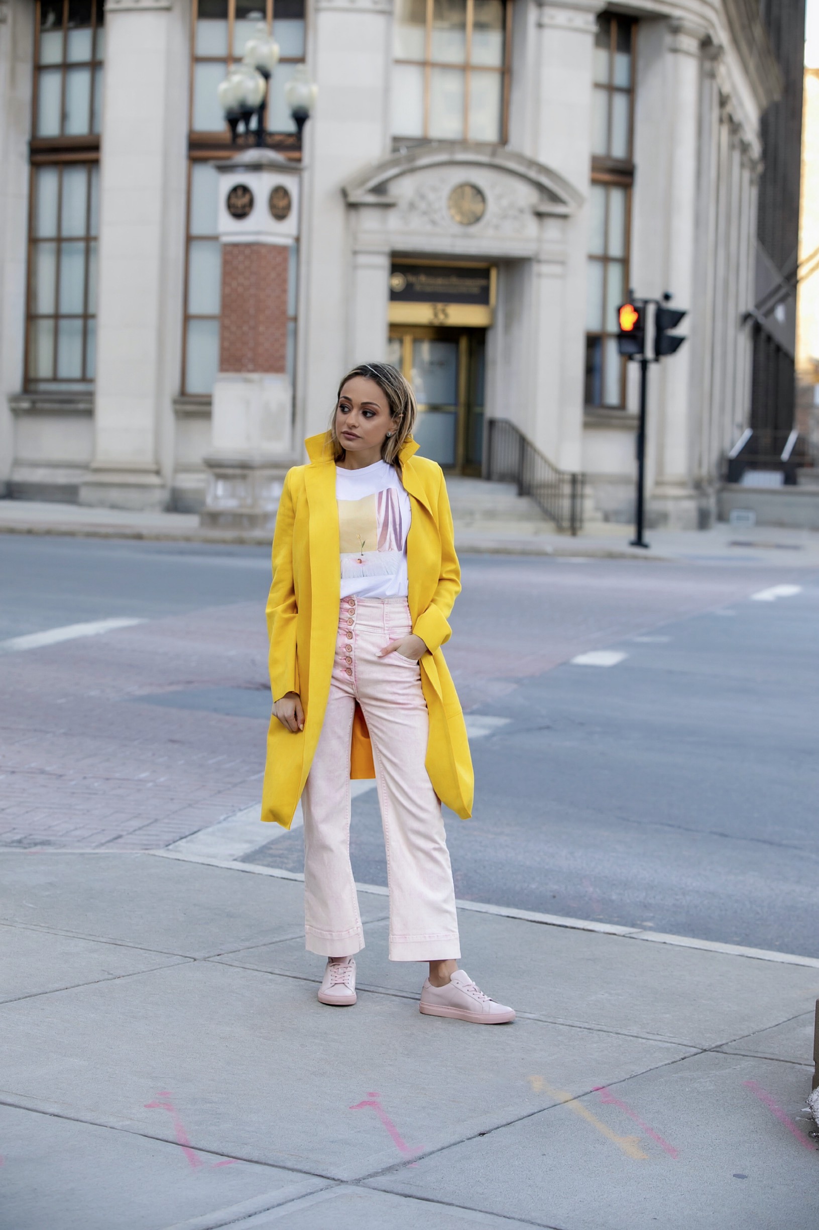 Don’t be afraid of color or of layering up multiple shades. If I did not add this graphic tee and yellow coat, I love the idea of pairing them with the matching denim top for a head-to-toe rose colored look.